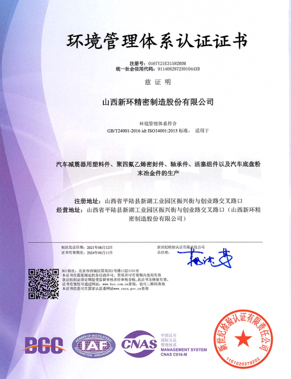 山西新環精密制造股份有限公司創建于1992年,是以研發、生產、銷售粉末冶金類、工程塑料類、橡膠制品類、氟塑類產品為主的高新技術企業。位于交通發達的山西省平陸縣城,距離三門峽市6 km,毗鄰隴海線,高鐵直達北京、上海、成都均為5小時左右,到達鄭州、西安皆為1小時,距離運城市機場35km。旗下子公司有:山西新環粉末冶金有限公司、山西新環科技有限公司、寧波新環氟塑料制品有限公司、寧波新環氟塑料制品有限公司軸業分公司、新勝達氟塑制品有限公司?,F有高、精、尖設備120余臺套,固定資產總額1.8億元,年銷售額2.6億元。